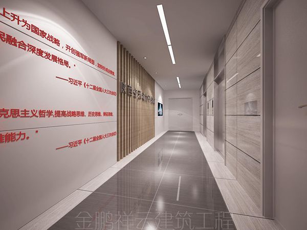 走廊的功能式人行通过及突出企业文化及空间美感的区域,整体的装饰风格要围绕,整体进行布局,用习主席的言语来进行logo墙的装饰,显示出国家给企业给予的帮助和鼓励。提高企业员工的积极性。